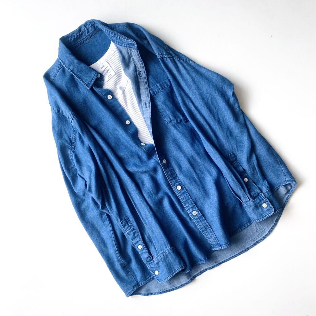 このSLOBE IENAのデニムライクシャツは再生繊維(セルロース)というとろみのある素材で作られており、夏の汗ばむ季節にもさらっと羽織れて、とにかく着ていて気持ちがいいです。試着してみて、あまりの気持ち良さに即購入の決断をいたしました。