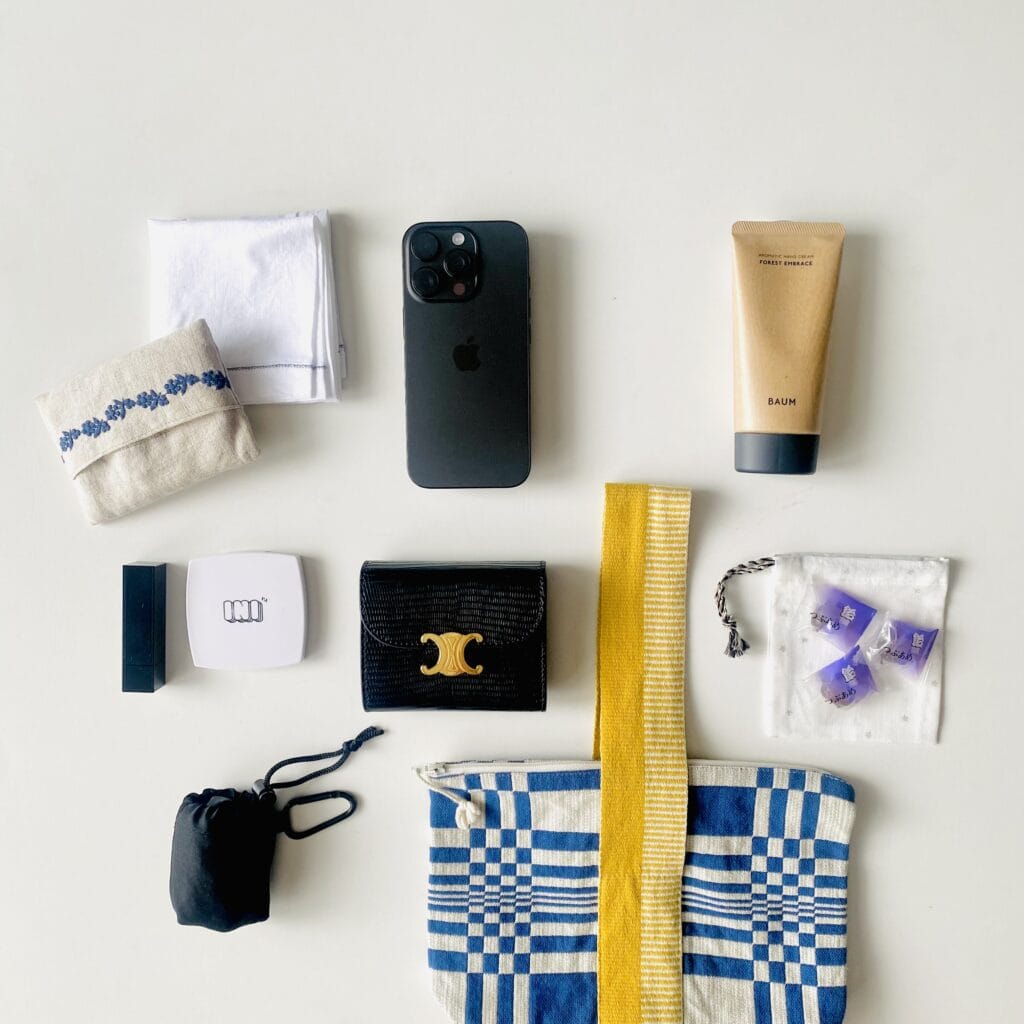 約10年前に購入したJohanna Gullichsenヨハンナグリクセンのテトラバッグ(黄色の持ち手にブルー×白の模様)は休日によく使うお気に入りのバッグです。バッグの中にはiPhone16pro、財布(去年、夫から25周年の結婚記念日にもらいました)、ハンカチ、ティッシュ、折りたためるエコバッグ(Standard Products¥330これが優秀!)推しアイドル(INIさん)のグッズのミラー、ケイト リップモンスター、プレゼントでもらったBAUMのハンドクリーム、あとは大阪マダムのお出かけで欠かせないグッズ「あめちゃん(金沢俵屋のつぶ飴)」を入れています。あめちゃんはのどを潤すのはもちろん、コミュニケーションのツールとして人間関係も潤してくれます。このバッグの中身のメンバー総出で休日出かけております。全てお気に入りです。