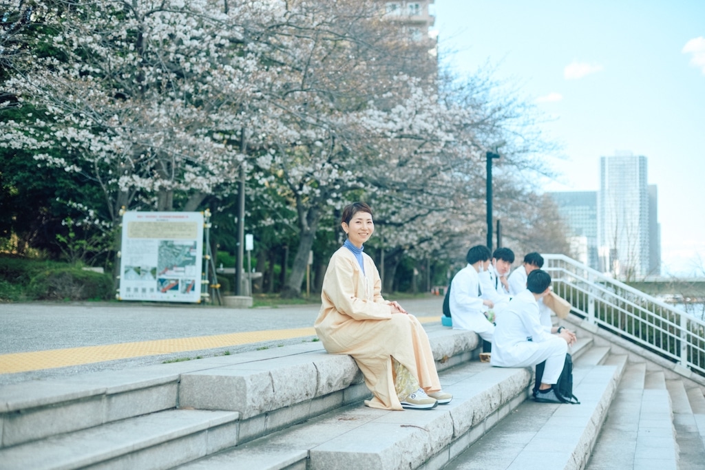 引き続き、勅使川原真衣さんに話を聞きます。勅使川原さんの撮影は、東京・築地にある聖路加国際病院の付近で行われました。抗がん剤治療で通っていた場所で検査結果待ちでよく使った喫茶店を感慨深そうに見つめます。撮影はちょうど桜が咲いていた時期で、隅田川沿いにはたくさんの花見客が訪れていました。「大人の遠足みたいで楽しいですね」と、カメラに向かっていろいろなポーズをしてくれる姿が印象的でした。