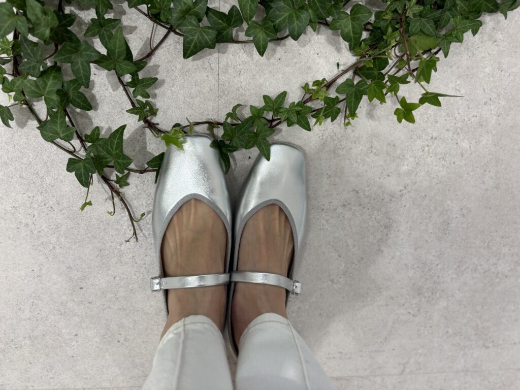 ご近所のお買い物から公園遊び、ママ友とのランチ会まで、あらゆるシーンで活躍してくれる一足。一見取り入れにくい? と思われがちなシルバーも、実は普段のスタイルにぴったり馴染む万能アイテムなんです。