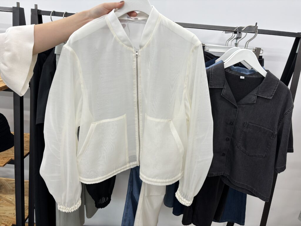 展示会場に入って、思わず真っ先に手に取ったのがシアー素材のブルゾン。日差しが強くなってきた今、さらっと羽織れて、しかもトレンド感たっぷり。実はこのテのブルゾン、今年は本当にたくさんのブランドから登場していて、街でもよく見かける注目アイテム。でもプライスを見て、思わず「えっ?」と声が出てしまいました。2990円。これ、おそらく市場最安値レベルではないかと密かに思っています。しかもただ安いだけじゃない!