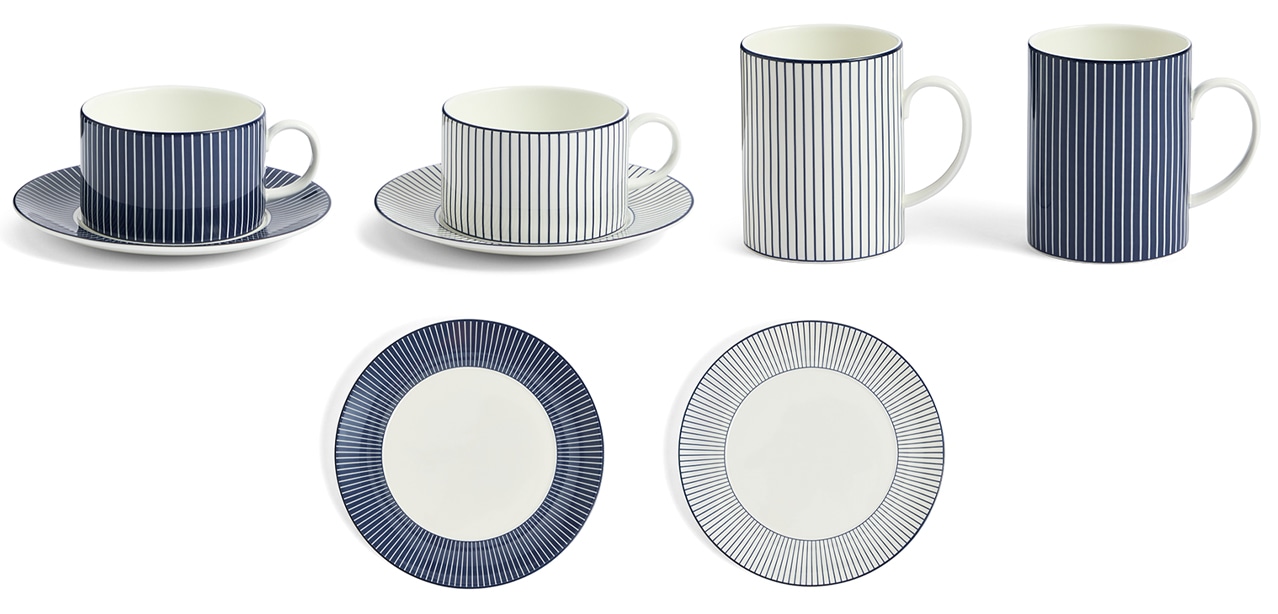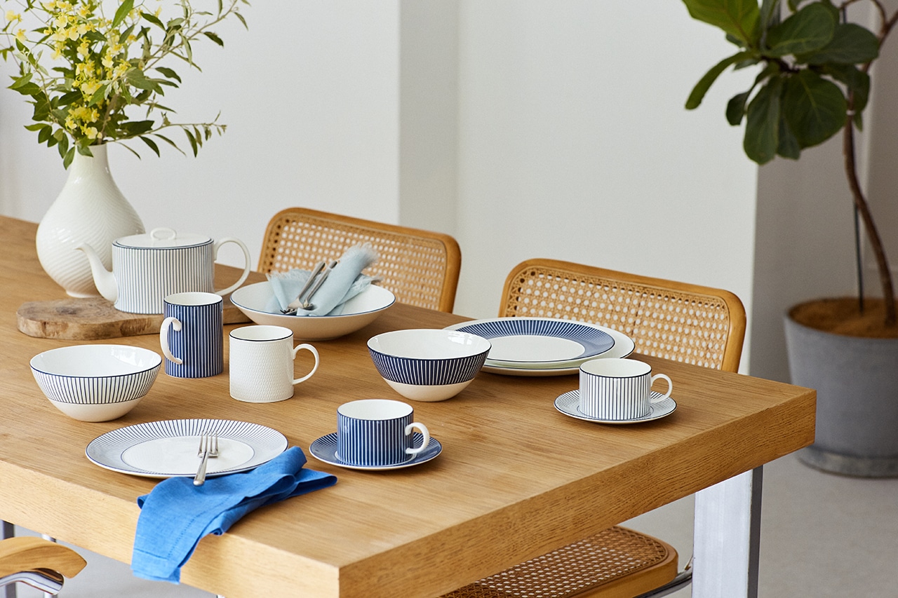 左から時計回りに、ティーポット ピンストライプ ホワイト ¥33000、ボウル 23cm ライン ¥5500、プレート 28cm ライン(下) ¥6050、プレート 24cm ピンストライプ ブルー ¥6600、ティーカップ&ソーサー ピンストライプ ホワイト¥11000、ボウル 16cm ピンストライプ ブルー ¥6600、ティーカップ&ソーサー ピンストライプ ブルー ¥11000、プレート 24cm ピンストライプ ホワイト ¥6600、マグ ライン ¥4400、ボウル 16cm ピンストライプ ホワイト ¥6600、マグ ピンストライプ ブルー¥5500 ホワイトフォリア ベース 23cm ¥16500 その他、スタイリスト私物