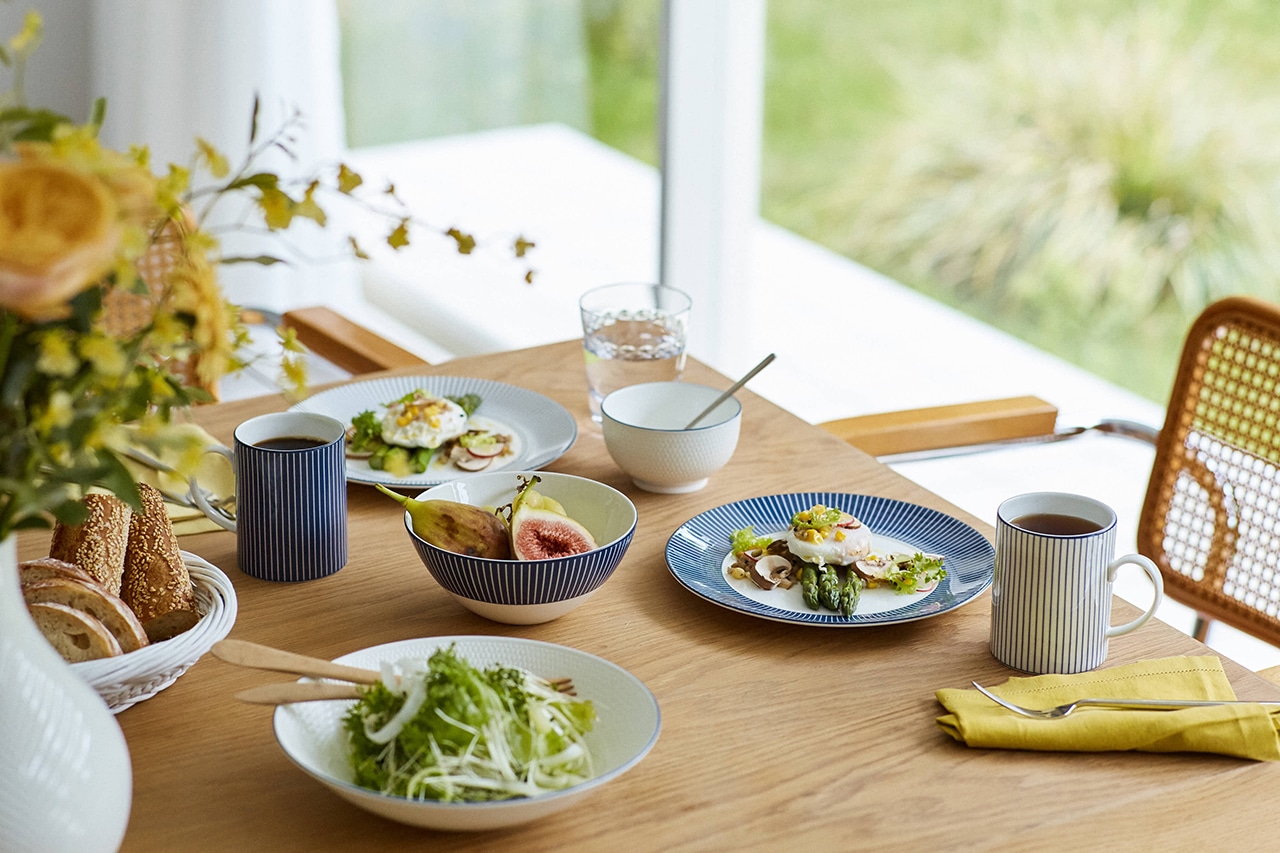 左から時計回りに、マグ ピンストライプ ブルー ¥5500、プレート 24cm ピンストライプ ホワイト ¥6600、ボウル 11cm ライン ¥4950、ボウル 16cm ピンストライプ ブルー ¥6600、プレート 24cm ピンストライプ ブルー ¥6600、マグ ピンストライプ ホワイト ¥5500、ボウル 23cm ライン ¥5500 ホワイトフォリア ベース 23cm ¥16500、ネオ タンブラー ペア ¥22000 その他、スタイリスト私物