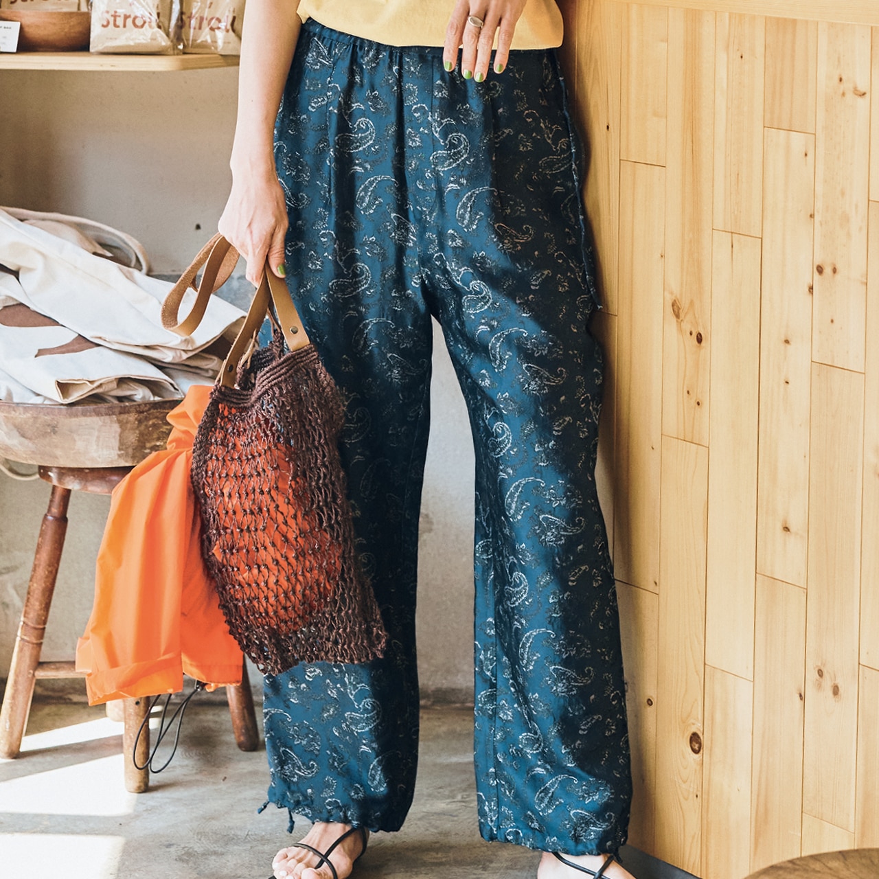 400年以上もの歴史を持つ、山形県米沢市で織られた「米沢織ジャカード」を使用。美しい光沢とドレープ感、多色の先染めによる深みのある色柄が特徴で、着こなしに上品な華やぎをもたらします。リラクシーなセミワイドシルエットは、裾のドローコードを絞るとほのかに優しい丸みが。シックなペイズリー柄は、LEEマルシェだけの復刻パターンです。