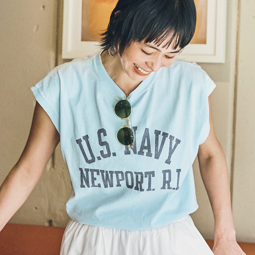 本格志向なヴィンテージ加工を得意とするレミ レリーフに別注したのは、オリジナルパターンのフレンチスリーブTシャツに、ミリタリー風のかすれロゴを配したLEE限定デザイン。サックスブルー×スミクロの組み合わせが、コーデのクールダウンに効果てきめんです。フレンチスリーブは袖ぐりに適度なゆとりがあり、二の腕がスラッと見える設計。