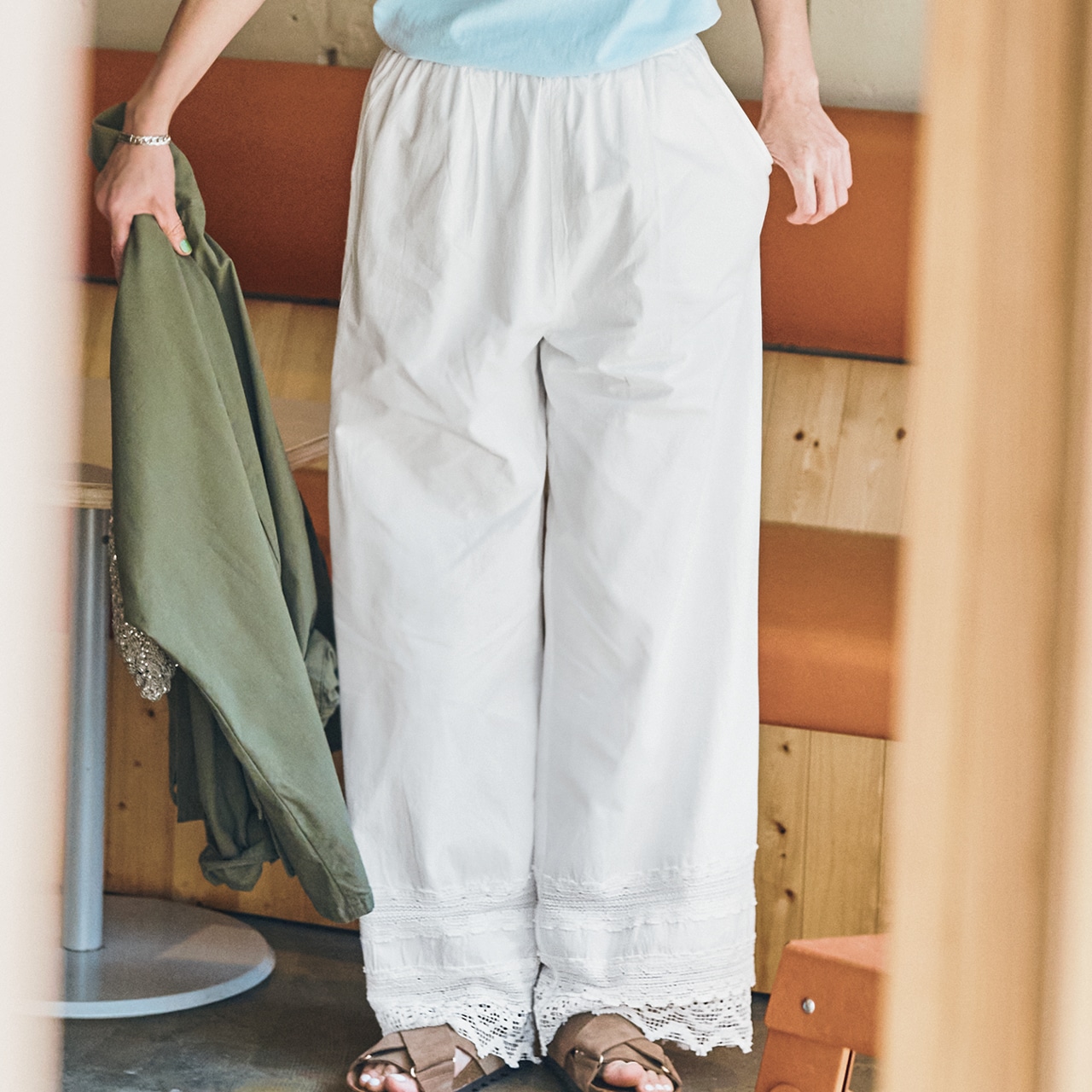 辛口カジュアル派も気負いなくはける甘さ控えめの裾レースパンツ。ややハリ感のあるコットンポプリン生地を使用したワイドシルエットは、汗ばむ気候でも足にまとわりつかず、風通し良好! 気になるレッグラインもさりげなくカバーします。裏地付きなので、インナーの透けも気になりません。ホワイトとブラックの全2色展開。