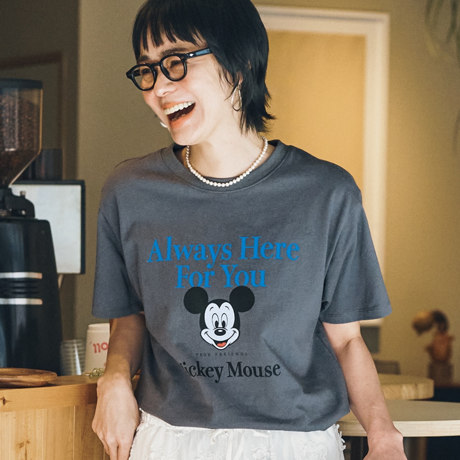 古着やミリタリーウエアから着想を得た、大人のためのカジュアルアイテムを発信する、LEEマルシェ初登場のハチイチブランカ。こちらはヴィンテージライクなミッキーマウスのグラフィックとロゴを、定番Tシャツのボディにプリントした別注デザインで、さらにダスティブルーのロゴはLEEだけ! 日常使いしやすいチャーミングさに仕上げました。