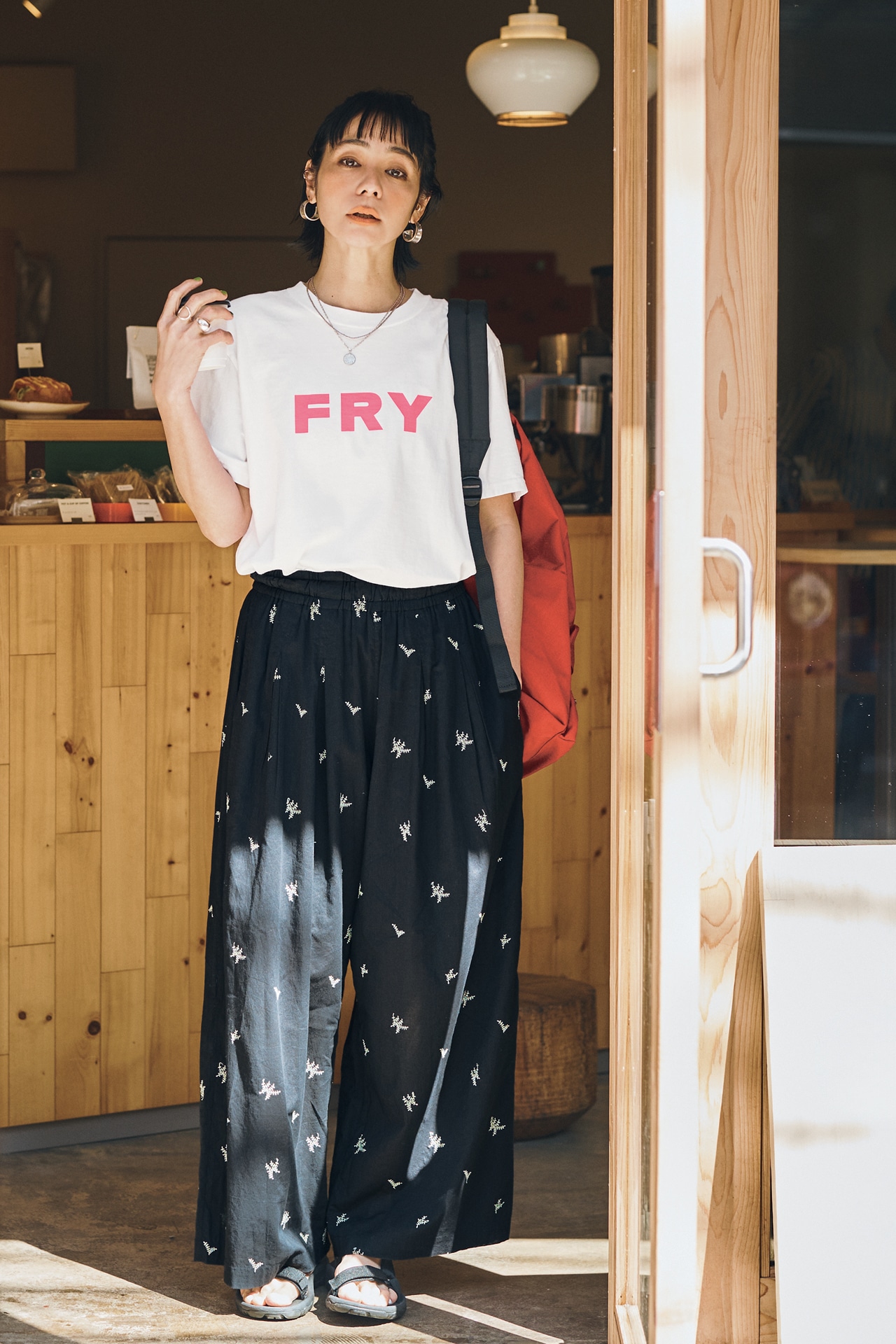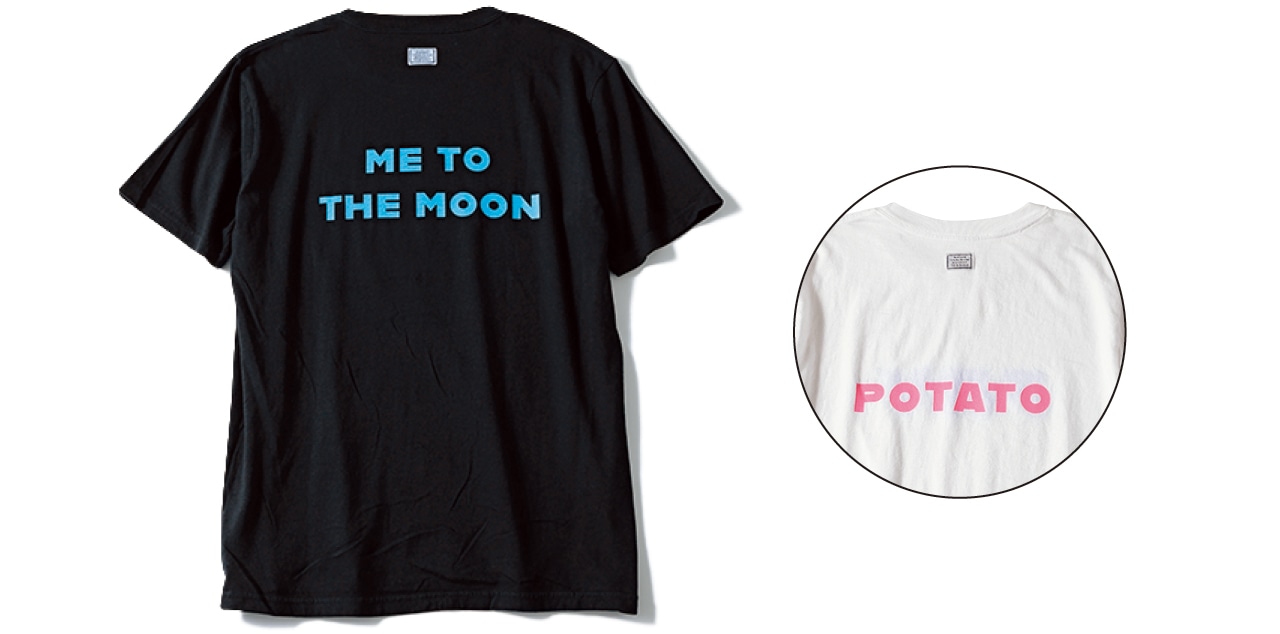 前後に配したロゴをつなげて読むと、単語や文章が完成するというユニーク発想の人気作。LEE別注のホワイト×ネオンピンクは「FRY POTATO」、ブラック×ネオンブルーは「FLY ME TO THE MOON」をプリント。柔らかくもしっかりとした天竺コットンの風合い&ユニセックスならではの直線的なシルエットが、ヘルシーな着姿を演出。