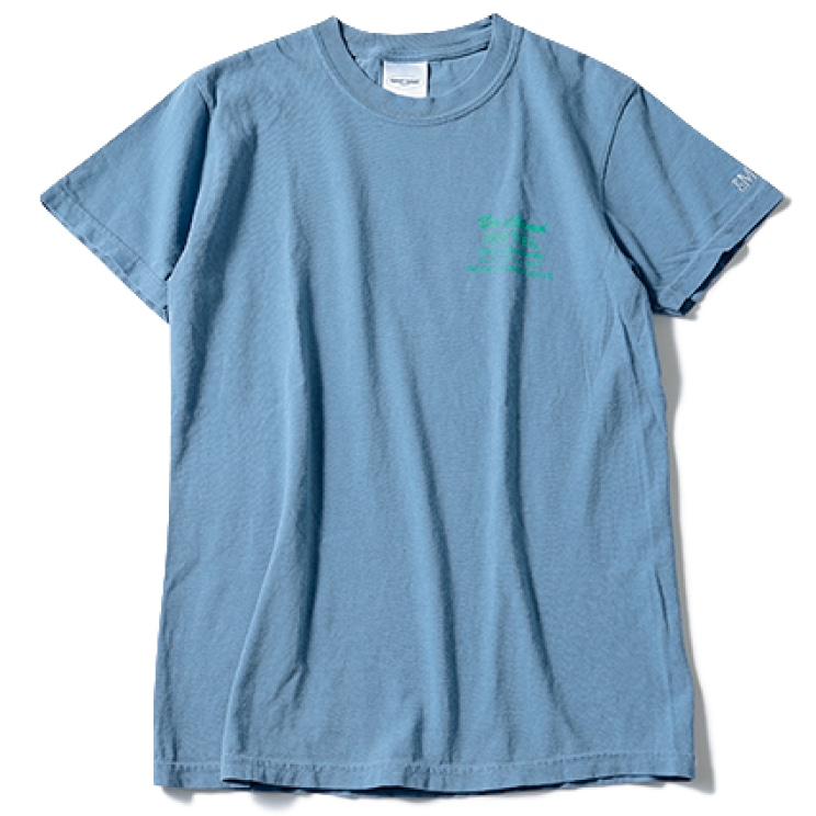 今季のテーマである〝Trip,Travel,Journey〞をイメージしたグラフィックを、左胸と背中にプリントした注目作。別注色のバターイエロー(Butter)とスモーキーなブルー(Blue Jean)は、製品染めならではの奥行きとニュアンスのある色合いです。ありそうでない配色も、コーデの鮮度アップに一役買って。左袖口にブランドロゴの刺繍入り。