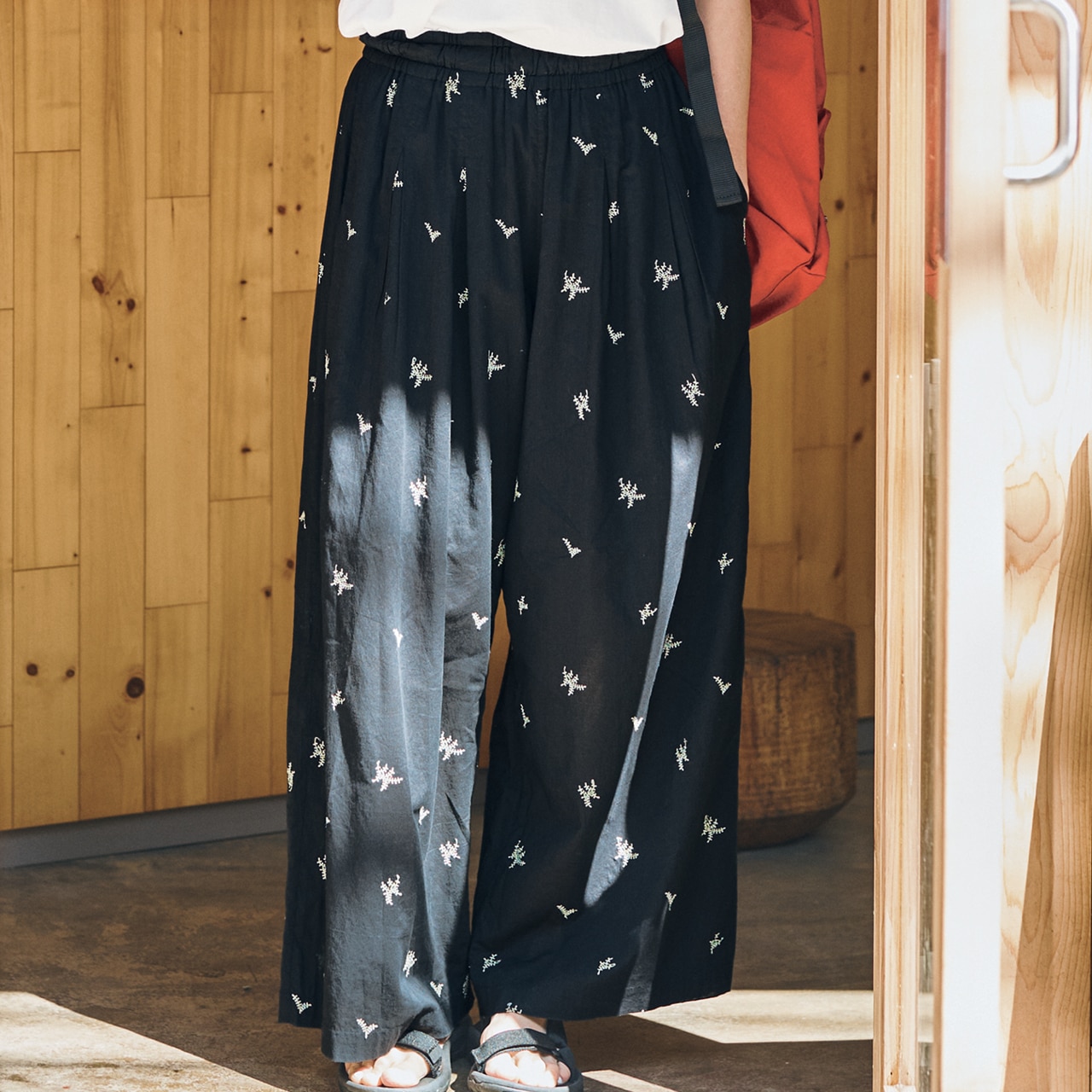 リーフモチーフの刺繍を施した生地は、ナチュラルで美しいドレープ感と柔らかさが魅力のコットンボイル。タックを内側で縫い止めておなかまわりのボリュームを抑えることで、リラクシーワイドシルエットながらも、すっきりとしたはき姿を叶える一本です。ウエストのギャザーゴムは、上下に細いゴムを渡す仕様。窮屈さを感じない心地よいフィット感です。