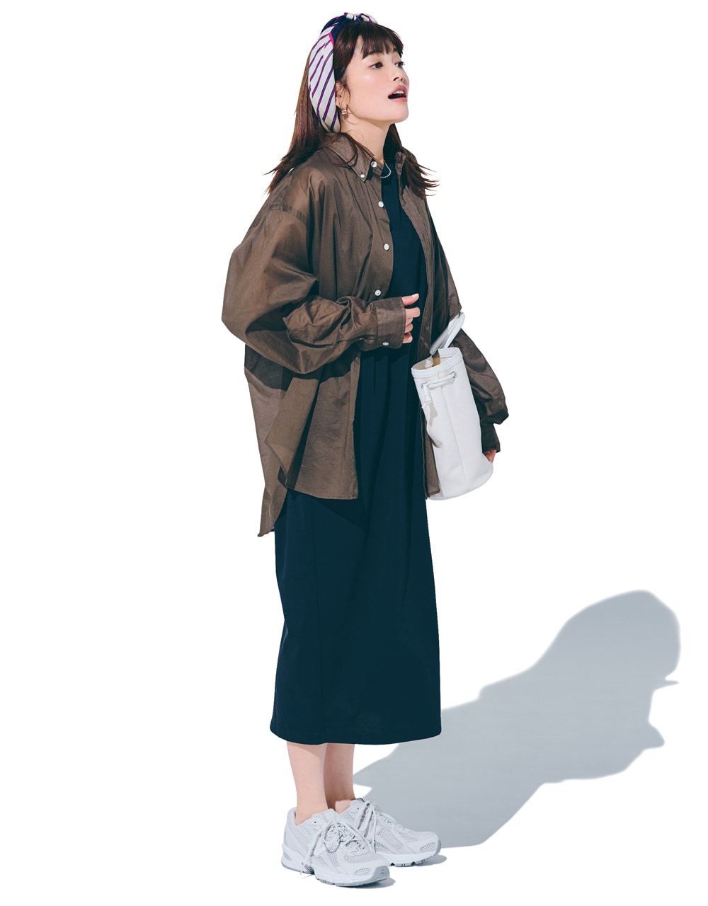 清涼感たっぷりのシアー素材と、こっくりブラウンカラーとの組み合わせがとびきり今っぽい1枚。スポーティになりがちなネイビーのタンクワンピース×白スニーカーの着こなしも、ブラウンシャツをさらっと羽織るだけで、ぐっとシックな印象に引き締まります。