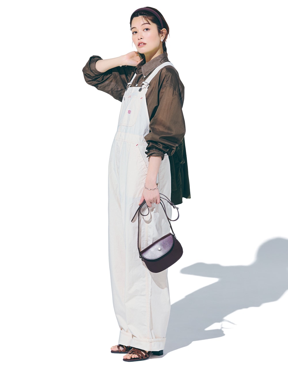 サロペットデニムの洒落見えのコツは、なんといってもインナー選び。ほんのり肌が透ける、オーバーサイズのブラウンシャツをゆるっと着れば、一気に大人っぽい印象に! 白デニムのほか、ブルー、インディゴ、ブラックなどどんなデニムにも合います。