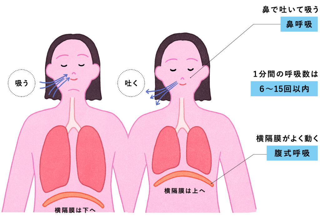 5~7秒かけて鼻から息を吐き、5~6秒で吸うのが理想。意識して吸おうとせず、自然に入ってくる感じで。