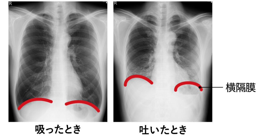 息を吐くと横隔膜が上がっておなかがへこみ、吸うと下がっておなかが膨らむ。下のようにしっかり上下するのが〝いい呼吸〞で、これを奥仲先生は「横隔膜呼吸」と呼んでいる。