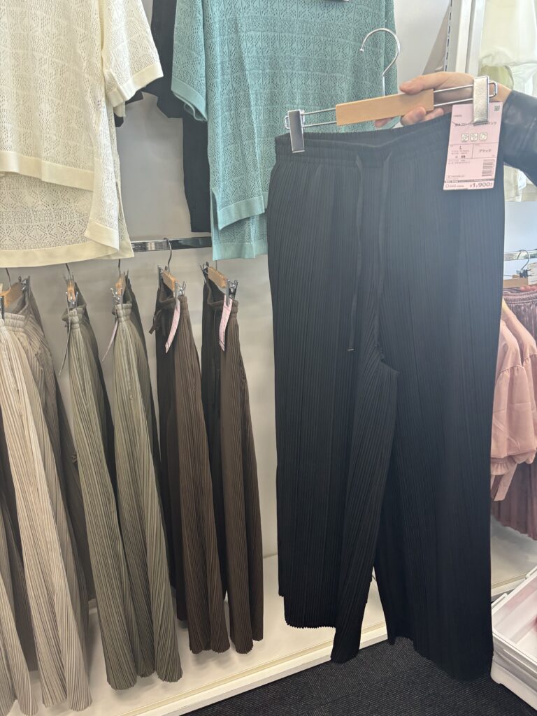 私の推しは、ウエストはゴム+ドローコード仕様で、長時間の移動でもラクちんな「撥水プリーツセミワイドパンツ」です。