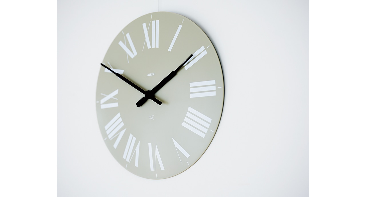 もともとはステンレスメーカーとして創業した「アレッシ」ですが、知る人ぞ知る名作時計が豊富。例えば、掛け時計「フィレンツェ」(下写真)は、クラシカルなローマ数字を使ったミニマルなデザインと、樹脂という素材のコンビが新鮮でモダンな印象。画鋲1個で掛けられるほど軽量なのも魅力で、掛ける壁を選びません。
