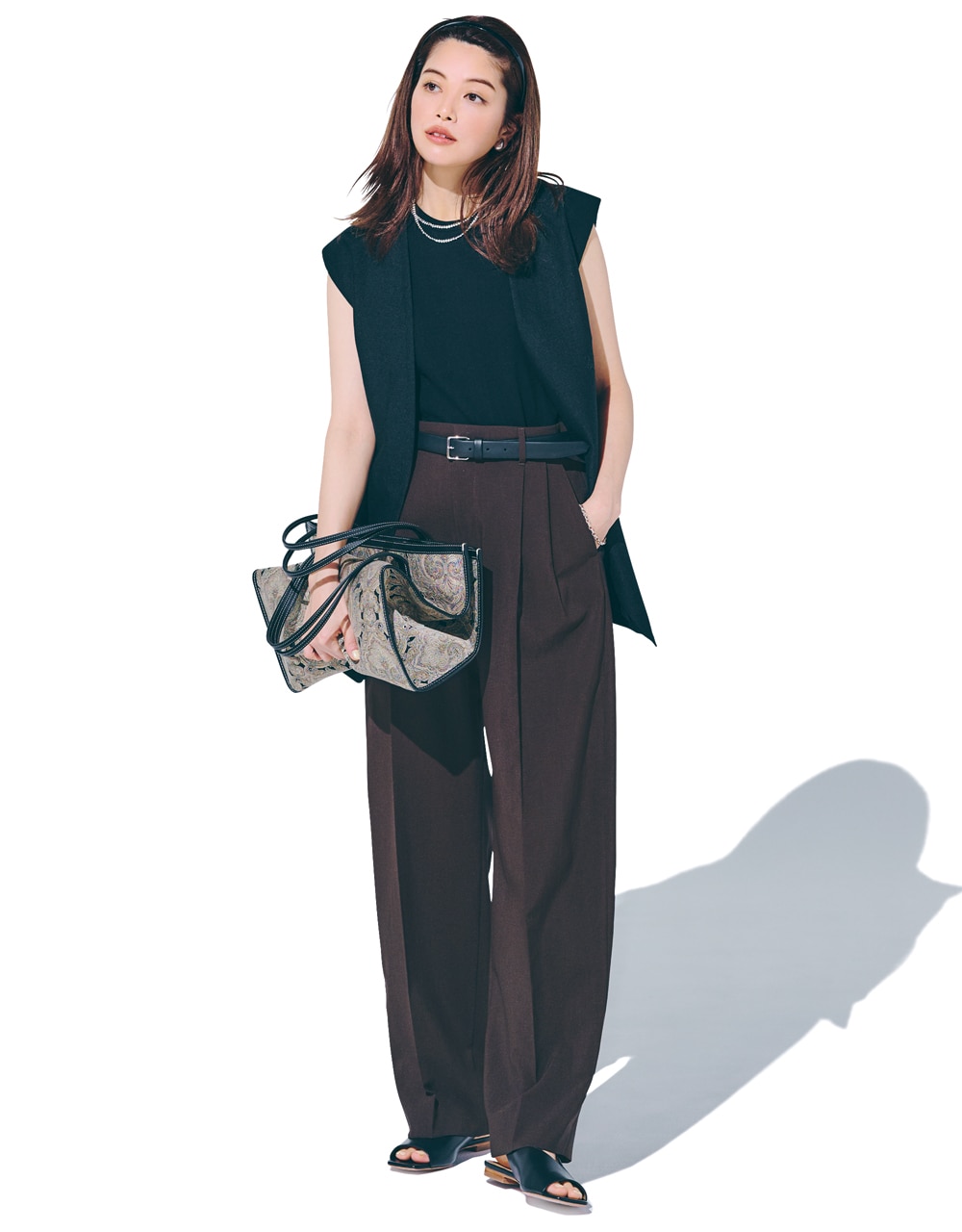 カジュアル派の鉄板ボトム・タック入りのワイドパンツを、落ち感が美しいダークブラウンの1本で更新。黒コーデのさし色として投入すれば、大人の余裕たっぷりのきれいめスタイルに。