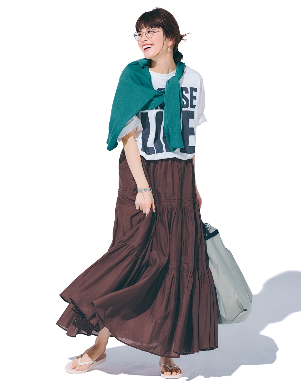 夏らしいコットンのティアードスカートも、ブラウンならぐっと大人な印象に。ロゴT合わせも子どもっぽさとは無縁です。