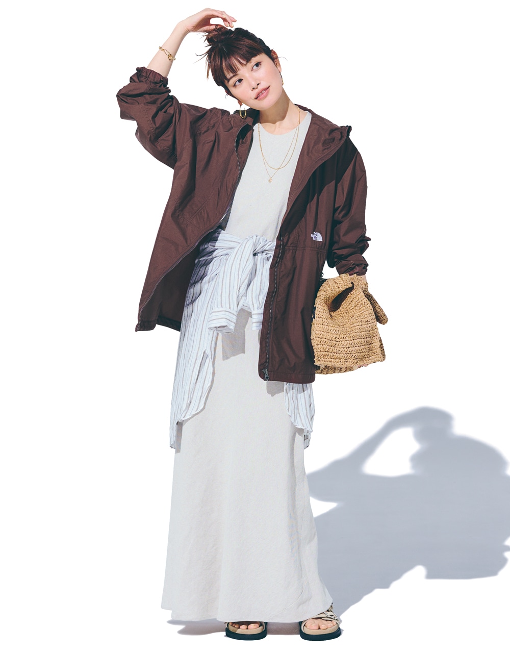 清涼感たっぷりのシアー素材と、こっくりブラウンカラーとの組み合わせがとびきり今っぽい1枚。スポーティになりがちなネイビーのタンクワンピース×白スニーカーの着こなしも、ブラウンシャツをさらっと羽織るだけで、ぐっとシックな印象に引き締まります。