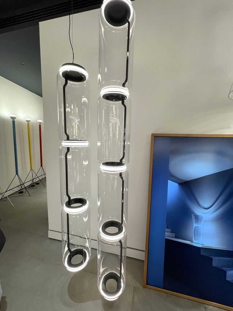 1962年、イタリアを代表する建築家でありデザイナーでもあるカスティリオーニ兄弟を中心に創設されたフロスは、照明器具のディフューザーとして『COCOON(コクーン)』という当時の新素材に着目しすばらしい拡散光を生み出すことに成功しました。今回のMDW中、本会場では新作を披露していたようですが、ショールームにも数々の名作や人気の照明が並んでいました。
