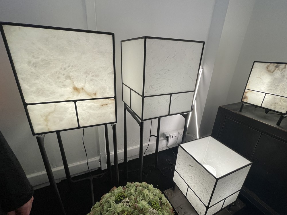 照明の明るさを0%から100%まで無段階で調整できるというのですからすごいですよね。手をかざすと明かりが点き、息を吹きかけると消えるランプのほか、まるで岩石のように見えるデザインや和紙を使った照明もありました。