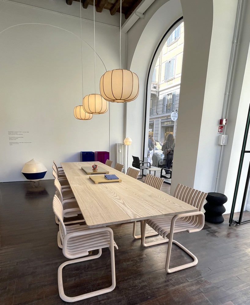 ここでは、椅子を中心とした家具の新作をまるでミュージアムのように飾り、奥に進むと様々な居住空間での美しいインテリアの提案がされていて、照明も和をイメージしたものが多く、世界各国からミラノを訪れた人の関心を集めていました。