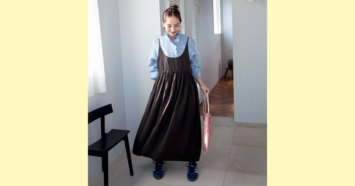 バスト下のギャザーから、ふんわり優しく広がる甘口キャミワンピは楽ちんで着回し力も抜群!/明日なに着る?