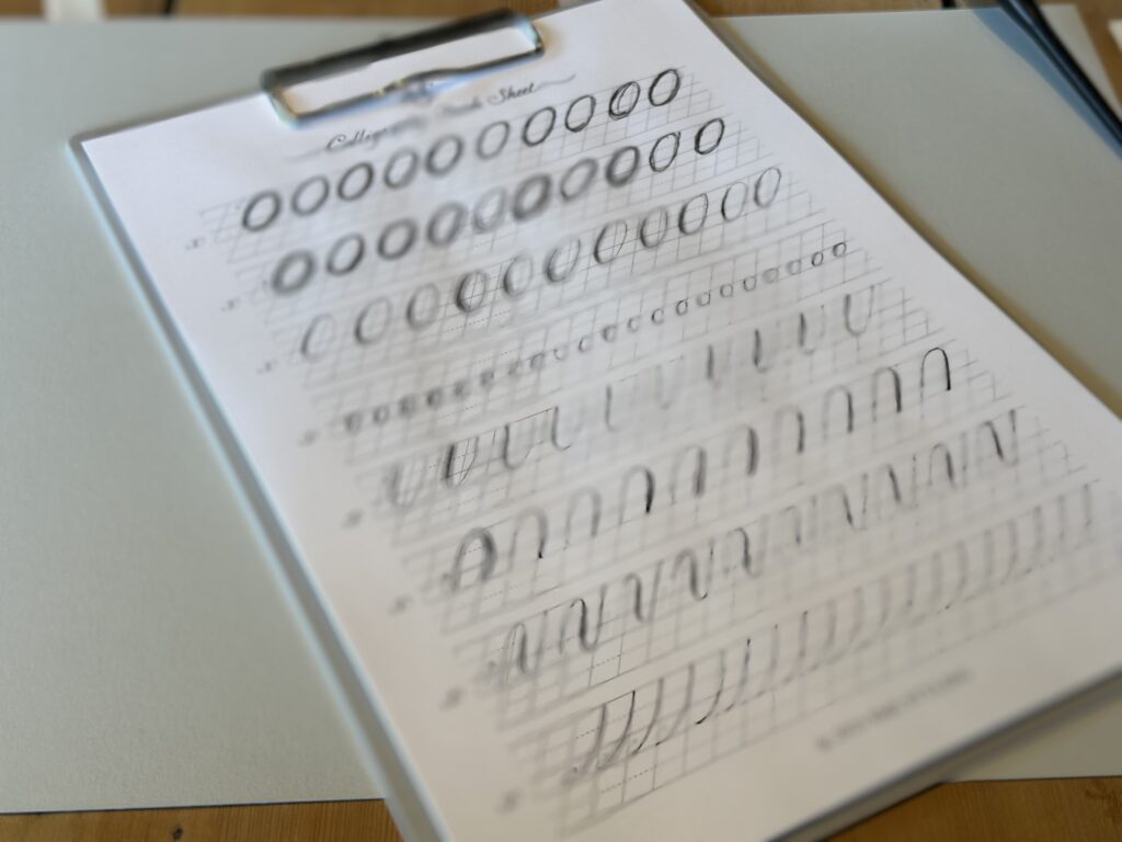 先生が用意してくださったモダンカリグラフィーのガイドシートに沿って、文字を練習していきます。インクで文字を書くのも初めて(そういえば中学生の頃、漫画家に憧れてペンで漫画を描いてた時期がありました!すっかり忘れていましたが……)なので、緊張して変に力を入れ過ぎてしまい、ペンを持つ手が震えました。