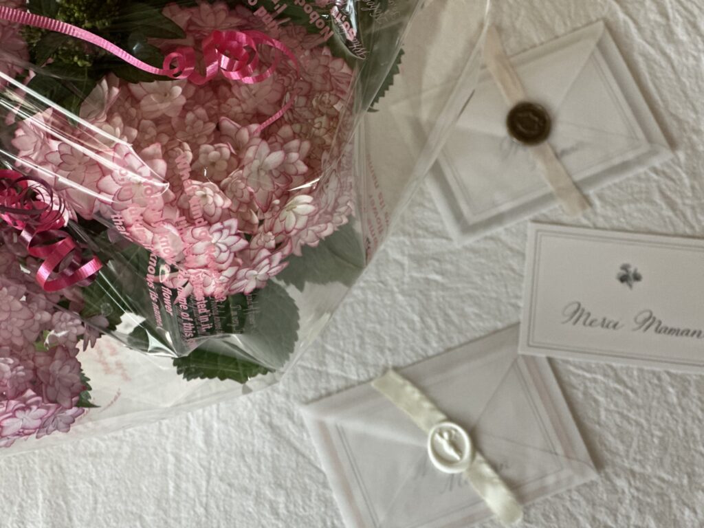 今年の母の日のプレゼント、義母には紫陽花とリネンのストール、母と伯母には色違いでUVカットの帽子を贈りました。それぞれ、モダンカリグラフィーで書いたカードを添えてプレゼント。手書きしたモダンカリグラフィーの文字に感動してくれたことが嬉しかったです。
