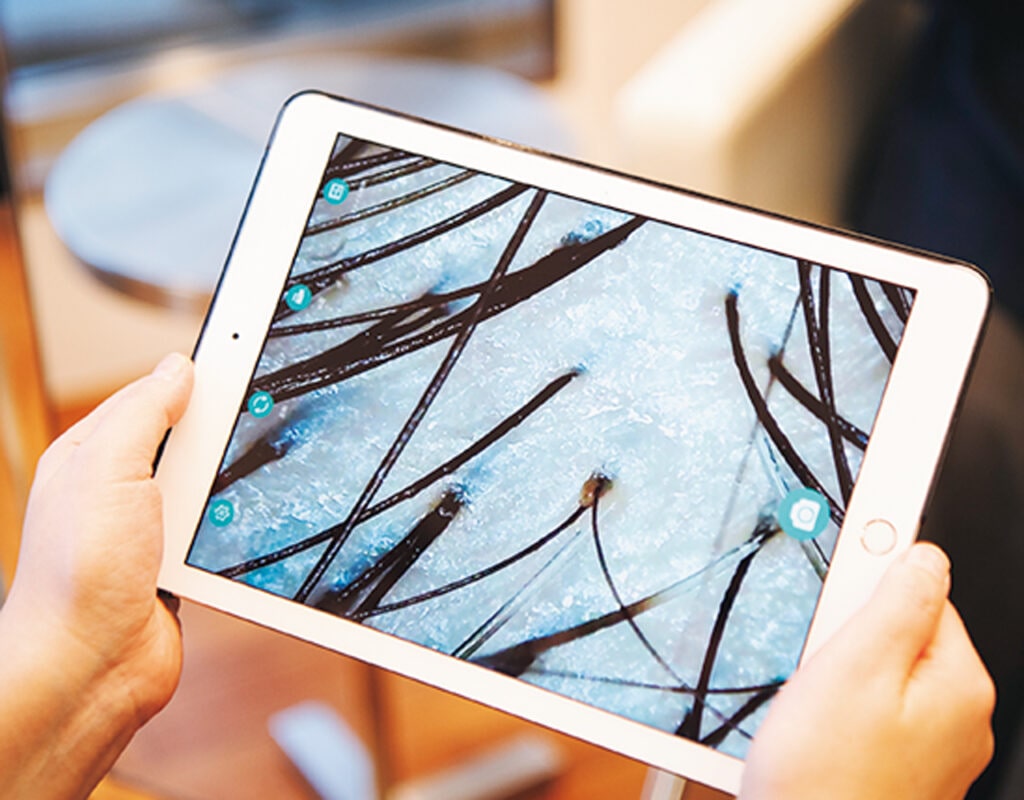 スコープカメラで撮影した頭皮をチェック。角質や毛穴の状態を見極め、目指す頭皮を相談する。