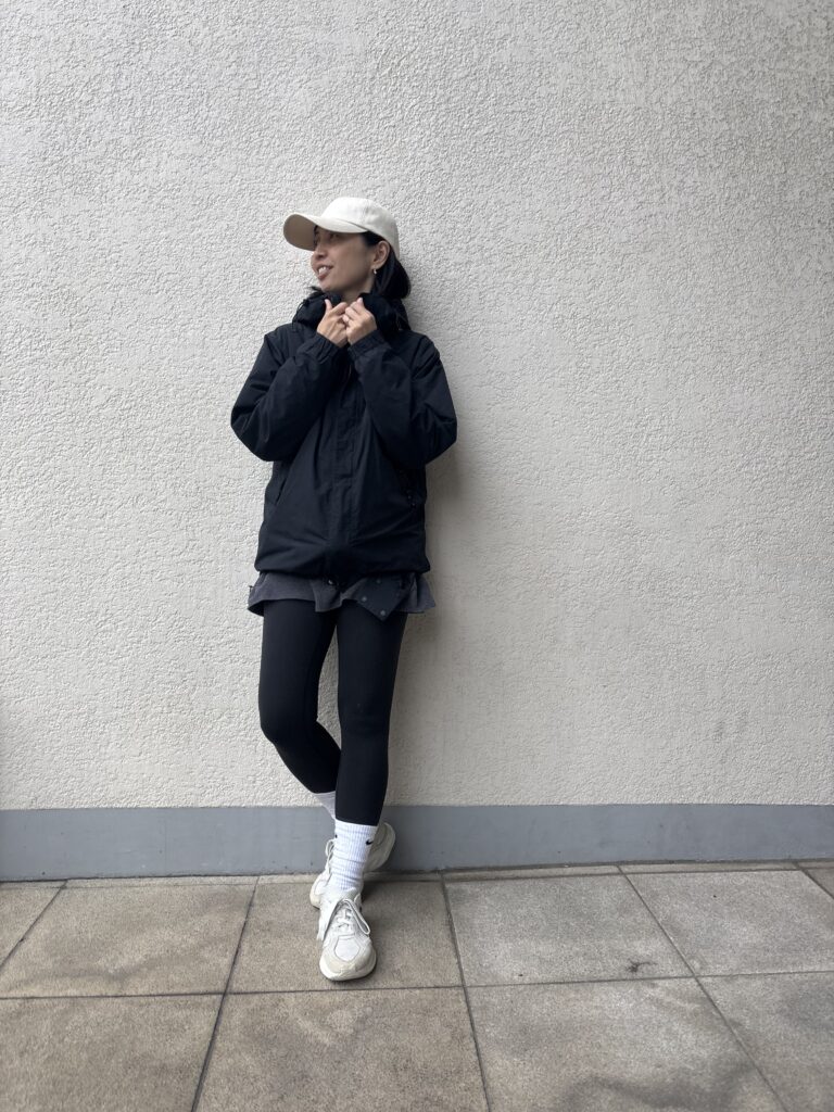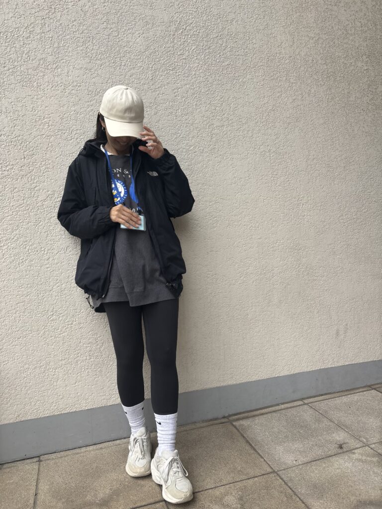 本当はもう少しおしゃれにしたかったけれど、グラウンドの冷たい風には勝てず……。とはいえ、歩き回るにはちょうどよく、ラフな着心地も◎でした。レギンスは先日、アメリカで購入した「ルルレモン」です。