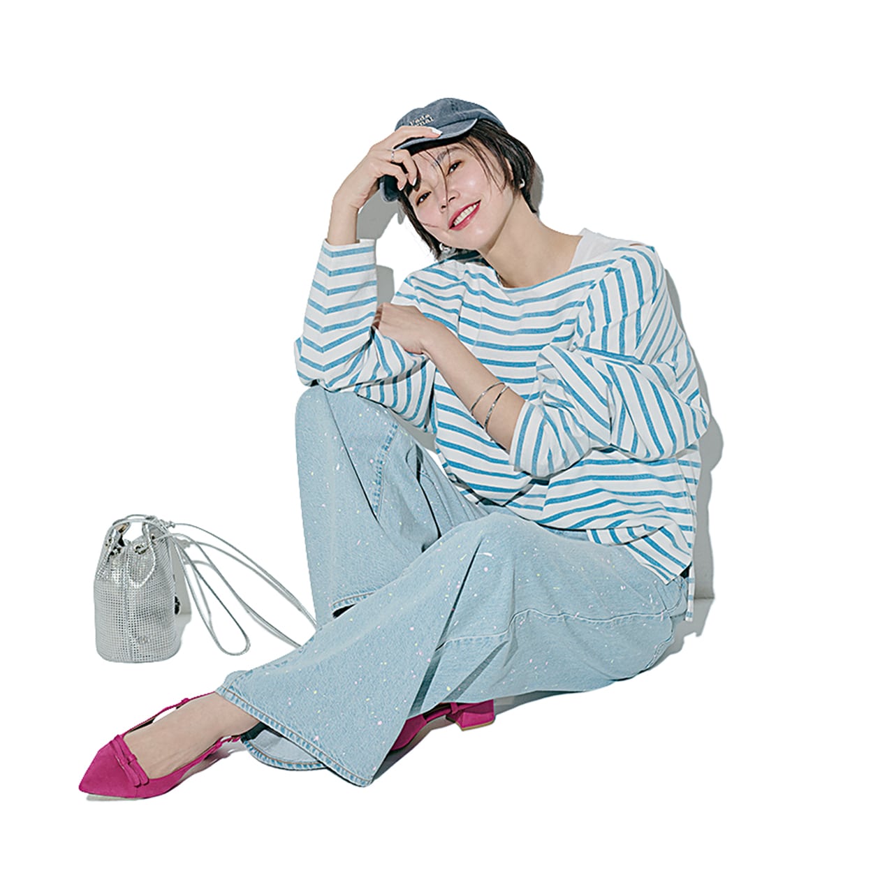 スーパーワイドのデニムに4 色を使った淡色のハンドペイントをプラス。水色ボーダーでトーンを揃えてモダンに。