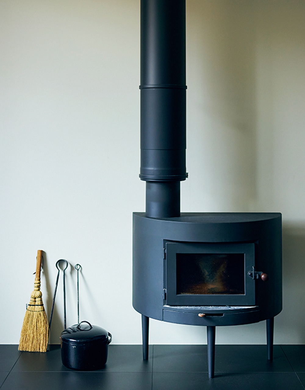 寝室のコンソールテーブルと暖炉を、同じ半径形に。ものを減らす代わりに、ディテールには徹底的にこだわった。重い鋳物の鍋は、年を取ると料理に使うには重いと、着火剤入れとして暖炉わきを定位置に。