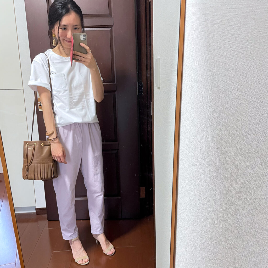 「足元は、LEE6月号でも特集されていたバーサンダルを合わせてみました。カラーパンツ×バーサンダル、白Tを外しで」