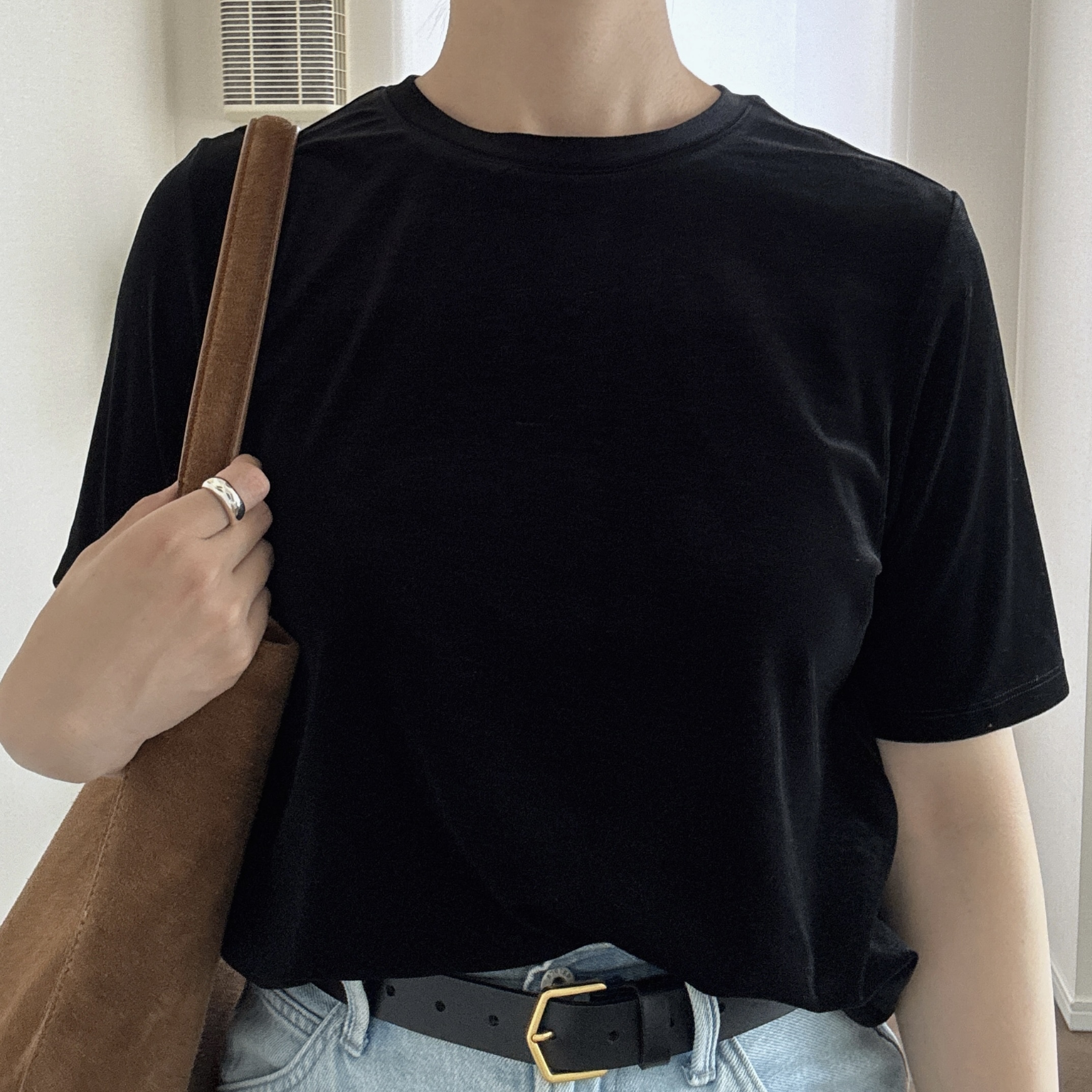 「Tシャツは普段からコンパクトに着ることが多いので、レディースだとスラブTシャツのシルエットのほうがよいのかなーーと思っていたのですが、ふとキッズのTシャツを見てみたら、デザインも生地感もこっちの方が好み! 素材はコットン100%でなめらかな肌触りです」