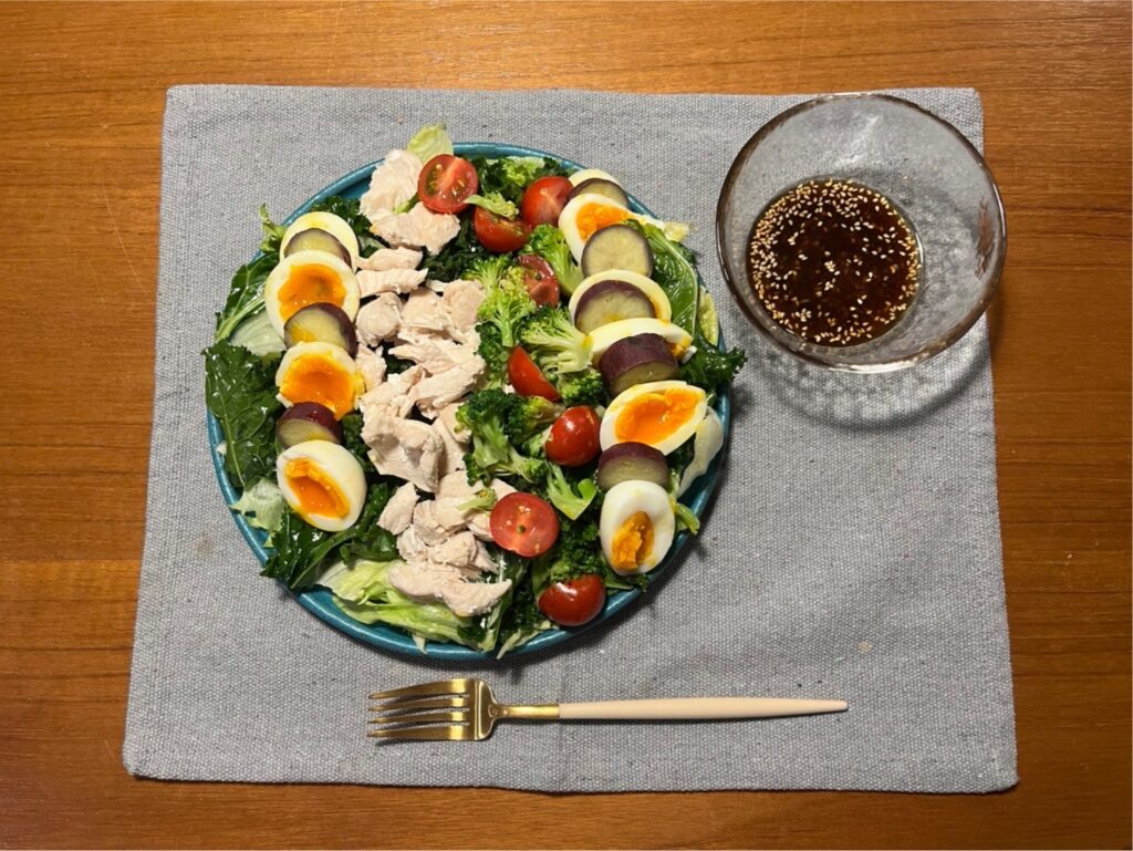 平日の食事は、鶏むね肉、ゆで卵、さつまいもを食べることが多いです。
