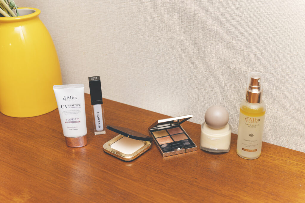 ツヤ肌メイクに欠かせないアイテムたち。下地はダルバのトーンアップサンクリームのパープル、クマや赤みにジバンシイのコントロールカラーのブルー、ファンデはヒンスのリキッドファンデ、パウダーはクレ・ド・ポー ボーテの「エサンシエル」、仕上げにダルバのスプレーセラムを。アイカラーはルナソルの【11 Savage Rose】です。