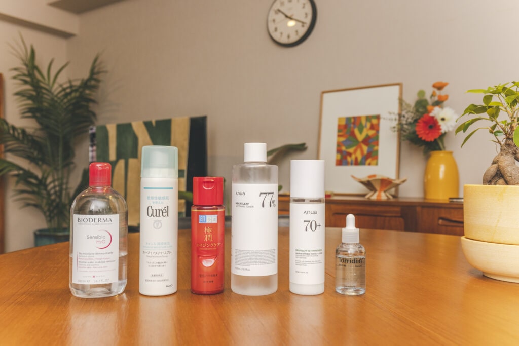 スキンケアのお気に入りアイテムはこちら。左から、ビオデルマのクレンジングウォーター、キュレルのスプレータイプ、肌ラボの極潤のエイジングケアローション。生理前はニキビができやすくなるので、アヌアのドクダミシリーズのローション&乳液に。美容液はトリデン。