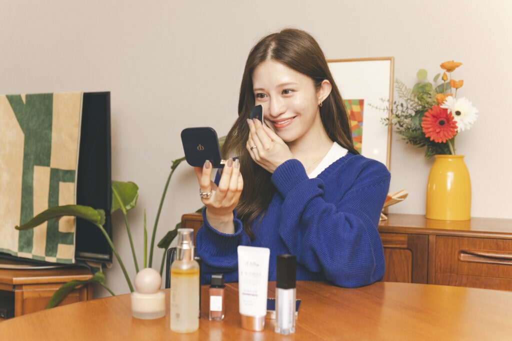 ベースメイクに力を入れた、”ツヤ肌メイク”をめざしています。色はのせすぎないようにして、アイ、チーク、リップを2色以内に抑えるように。コスメは美容家さんのSNSなどでリサーチ。その後、なんでも揃うアインズ&トルペに行って、実際に試してから購入します。