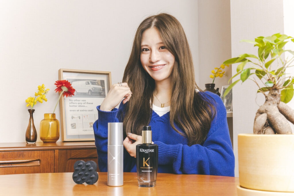 ヘアケアは、ウカの頭皮ブラシ、エックストリートメントのエマルジョン、ケラスターゼのトリートメントオイルを愛用。