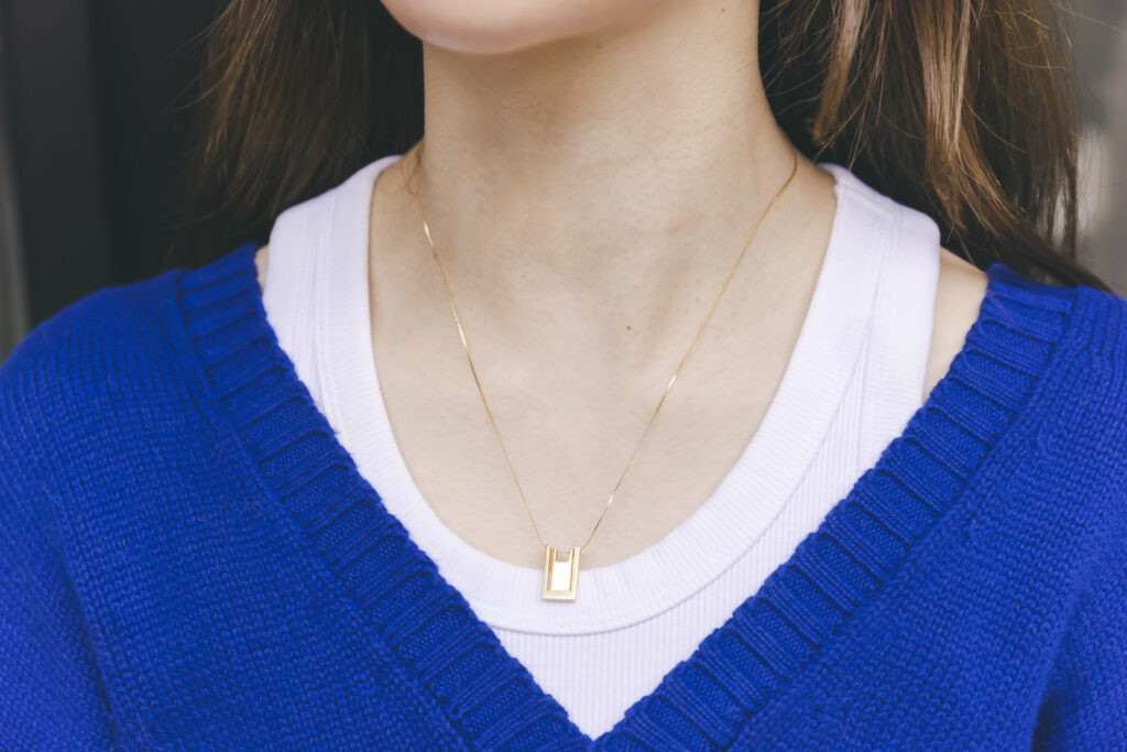 ペンダントは夫の祖母が使っていたものを、チェーンを変えてリメイク。形見分けでいただいたもので、大切にしています。