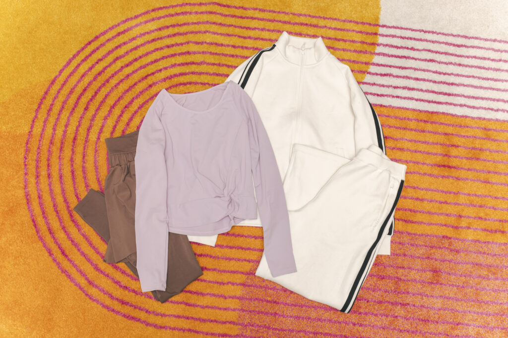 お気に入りのジムウエア。白のジャージはユニクロのキッズの160㎝サイズ。ジムのときにはおるのにちょうどいいんです。