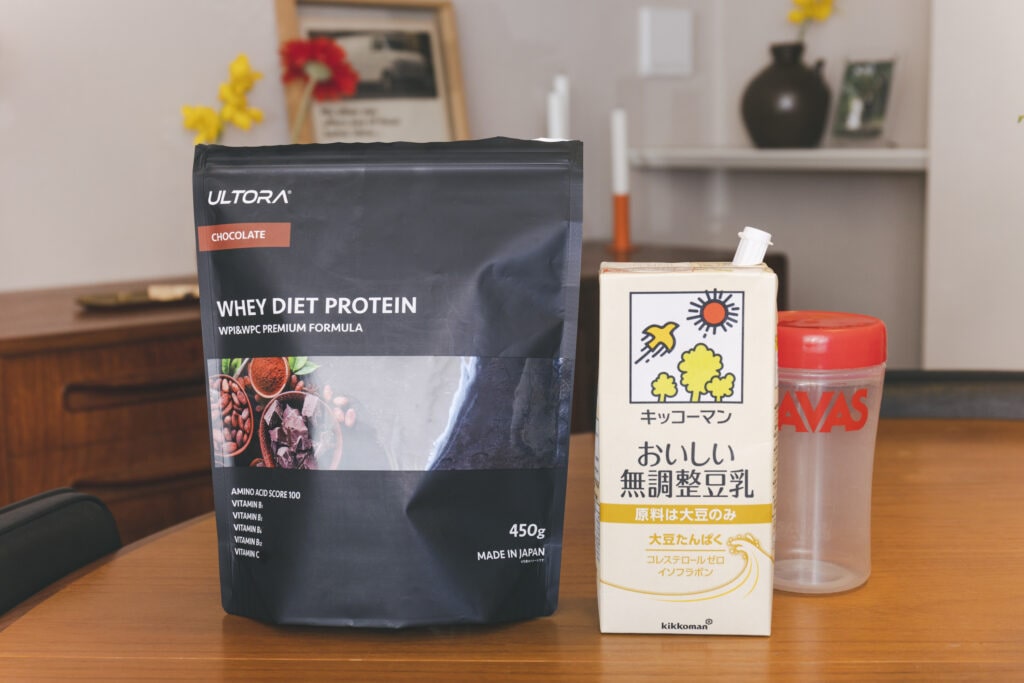 プロテインは、無調整豆乳に混ぜて、毎日必ず飲むように。ウルトラのホエイダイエットプロテインはどれも本当においしくてお気に入り。とくにチョコレート味が一番好きです♡