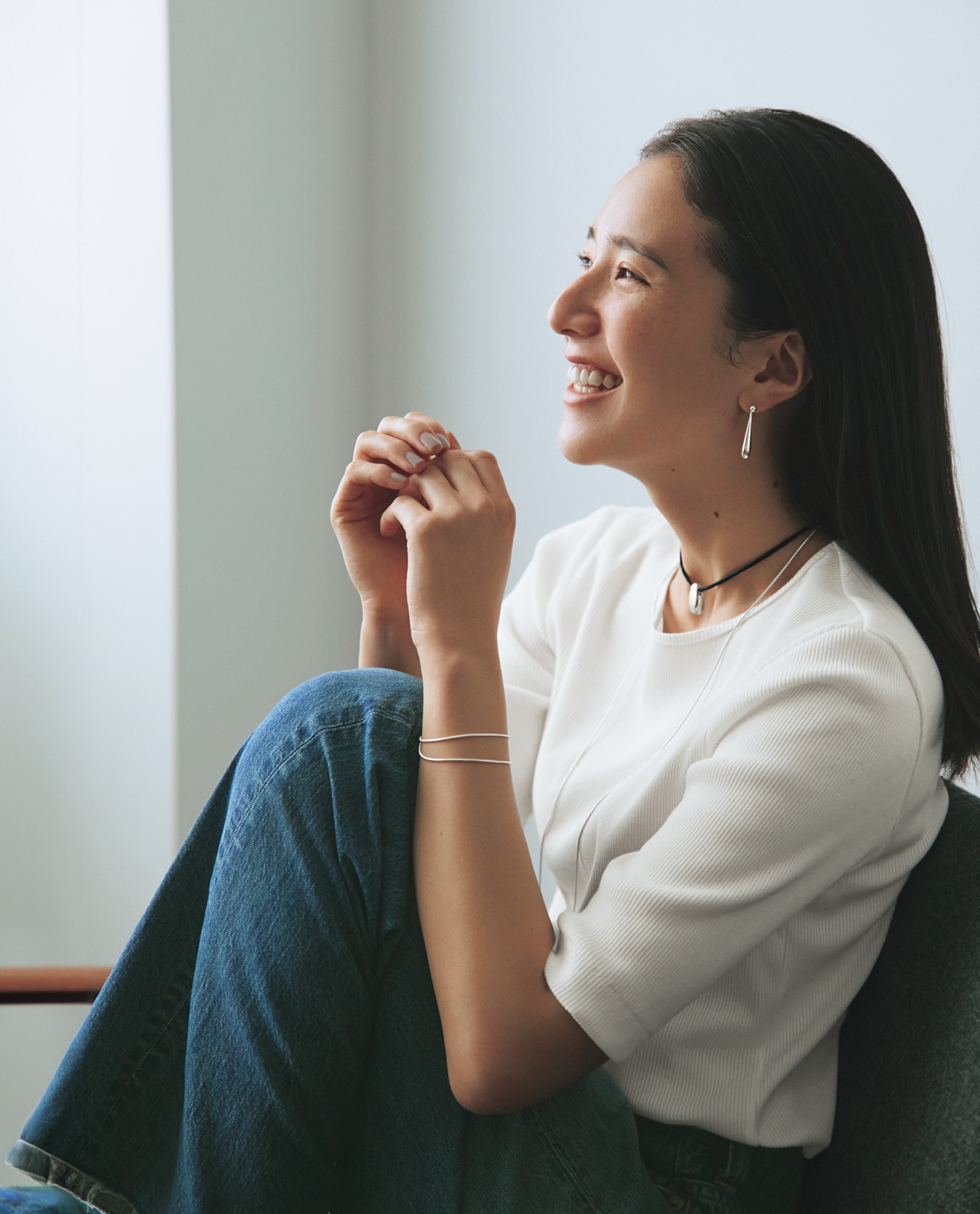 白Tシャツ×デニムのシンプルコーデにつければ、カジュアルなコンビにたちまち“お出かけ感”が宿って。「ネックレス、ピアス、ブレスレット。どれか1点を取り入れるのはもちろんのこと、3点すべてを一緒につけても決まるデザインを目指しました。手持ちのネックレスや時計をレイヤードしても素敵なんですよ」(麻琴さん)。webでは麻琴さんの私服コーデに合わせ、誌面では書ききれなかった想いやアイデアも掲載しています。ぜひこちらからチェックして!
