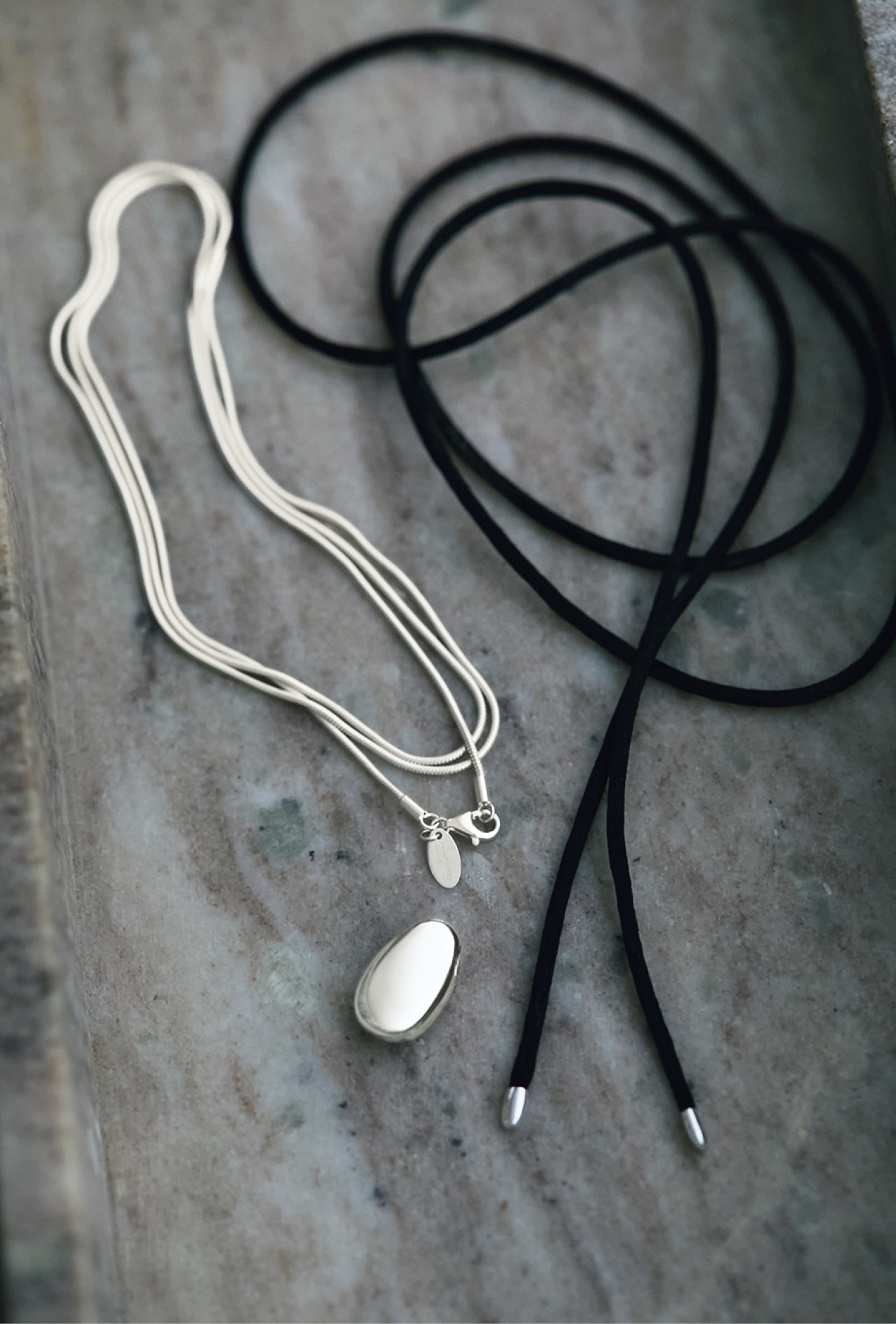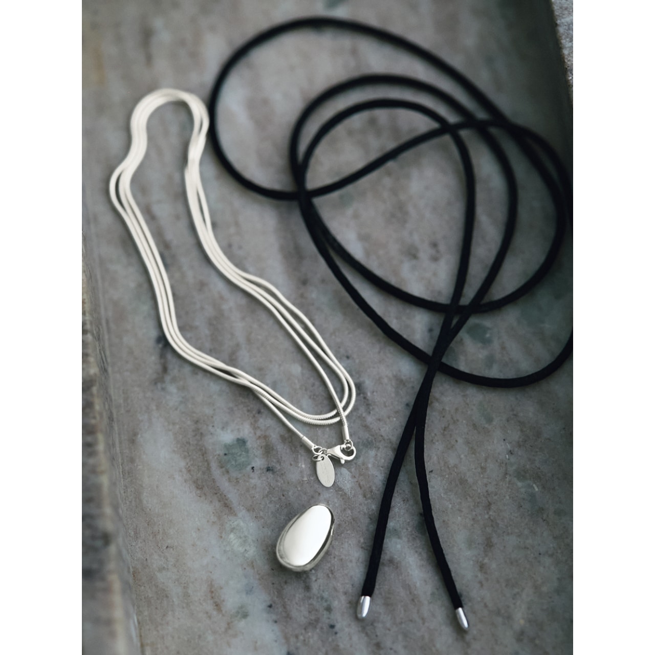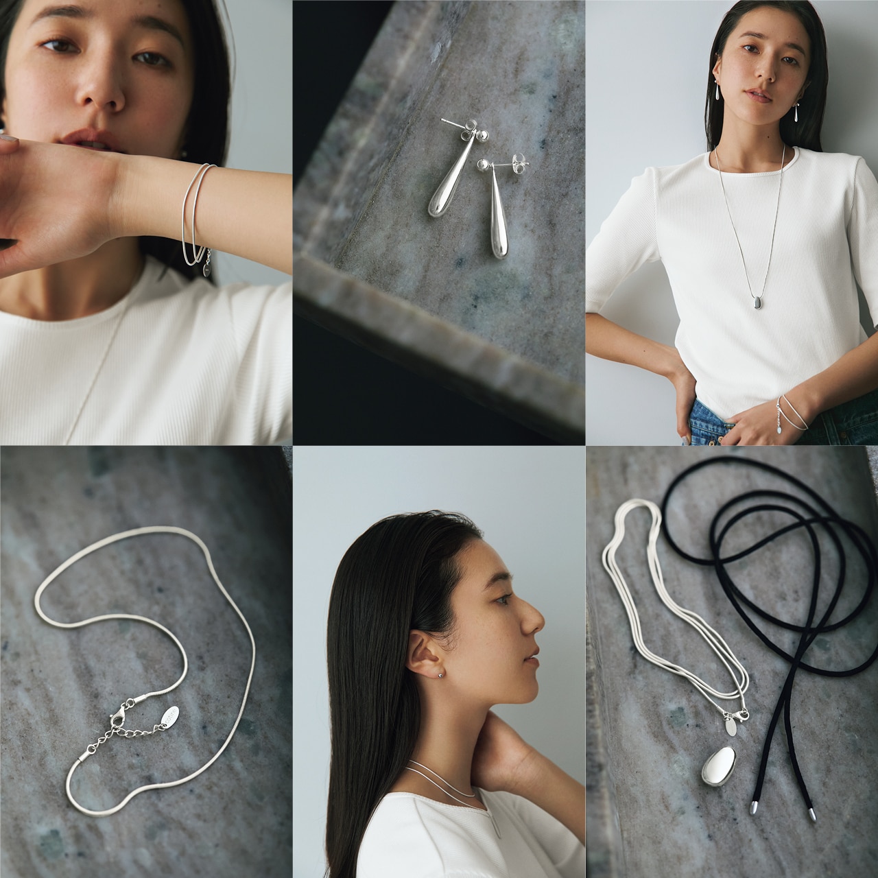 ロングでも2連でもつけられるシルバーチェーンとシルクコード、どちらにもつけられる雫形のシルバートップがセットになったマルチネックレスが誕生。「シルバー925にこだわったのは、本物の存在感があるから。経年変化が味わえるのもシルバーならではの楽しみです。シルクコードは肌あたりが心地よく、ちょっとした特別感を運んでくれるはず」(麻琴さん)