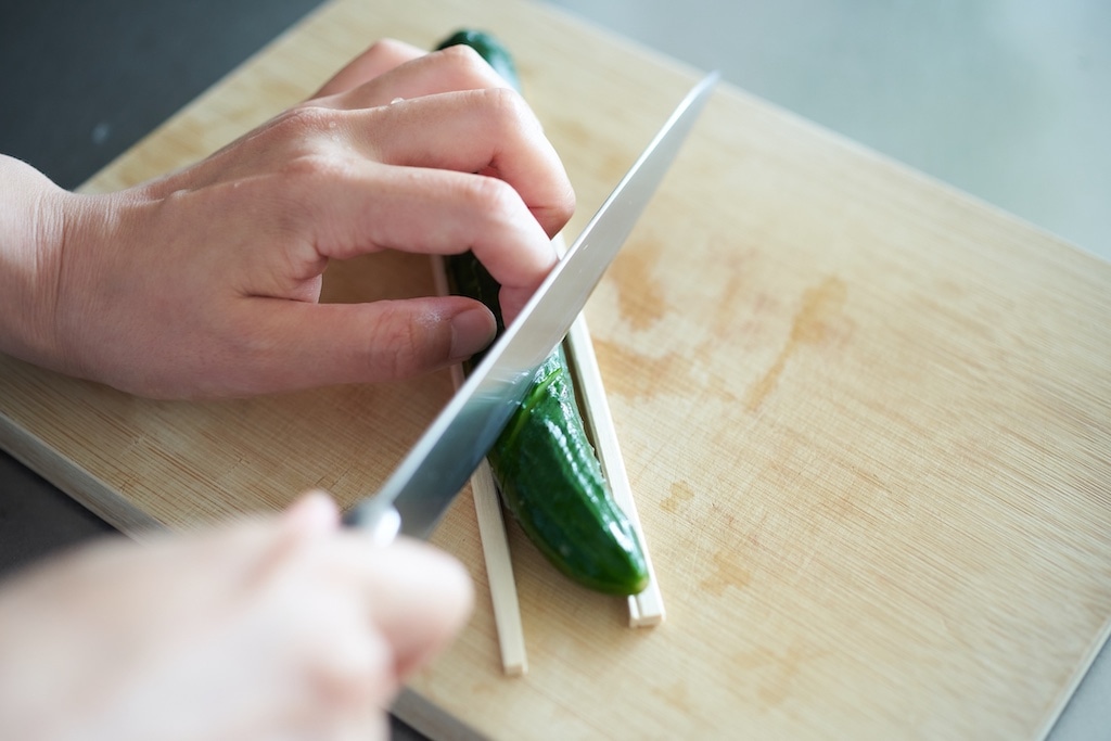 - きゅうりは割り箸ではさんで、上から斜めに細かく切り込みを入れる。きゅうりの上下を返して、同様に切り込みを入れる。