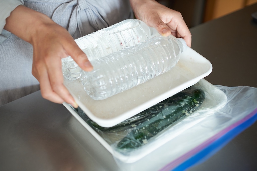 - ジッパー付き保存袋にきゅうり、混ぜ合わせた(A)を加えてよく揉み、1kgの重石(500mlのペットボトル2本など)をのせて冷蔵庫に一日おく。