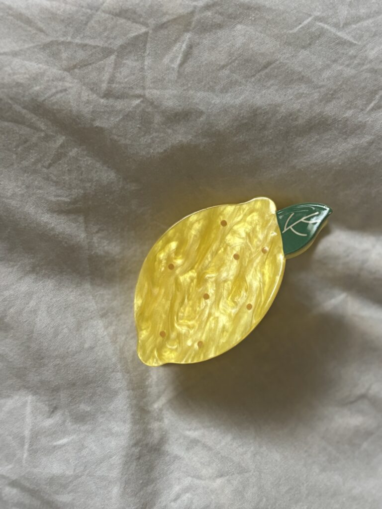 ここ数年、街でもよく見かける、かわいいヘアバレッタですが、レモン型がたまらなく可愛いなーと思って3ドルで購入。パチンと留めるだけで髪まわりが一気に華やかになるって、こういうこと。