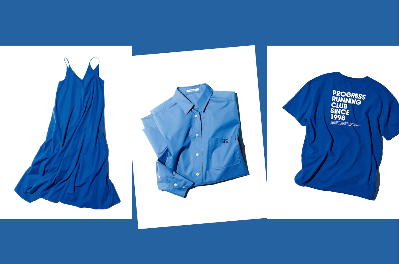 ブルー好きはもちろんのこと、きれい色に苦手意識があるという人も、"定番アイテムをブルーに置き換える"ことが、ブルーを素敵に着る近道のような気がしています。黒ワンピース、白シャツ、白Tなど、カジュアル派の夏のおしゃれに欠かせない定番服。いつもの地味色をブルーにチェンジしただけで、これまで慣れ親しんだスタイルが新しくなる。空のブルー、海のブルー。夏らしさとリンクさせて、一歩先のおしゃれに挑戦してみてください。