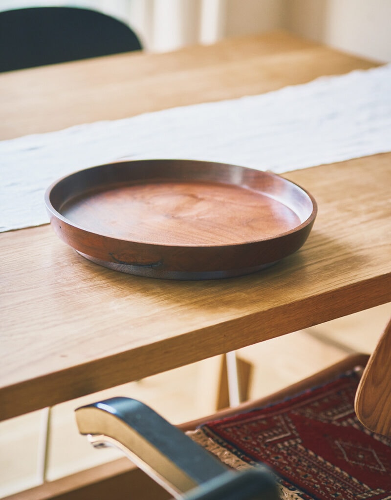 お菓子をのせて出したり、アクセサリーをディスプレイしたり、場所も用途もさまざまに使えるトレイは、頻繁に活用しているアイテム。特にお気に入りなのが、木工作家である盛永省治さんのもの。